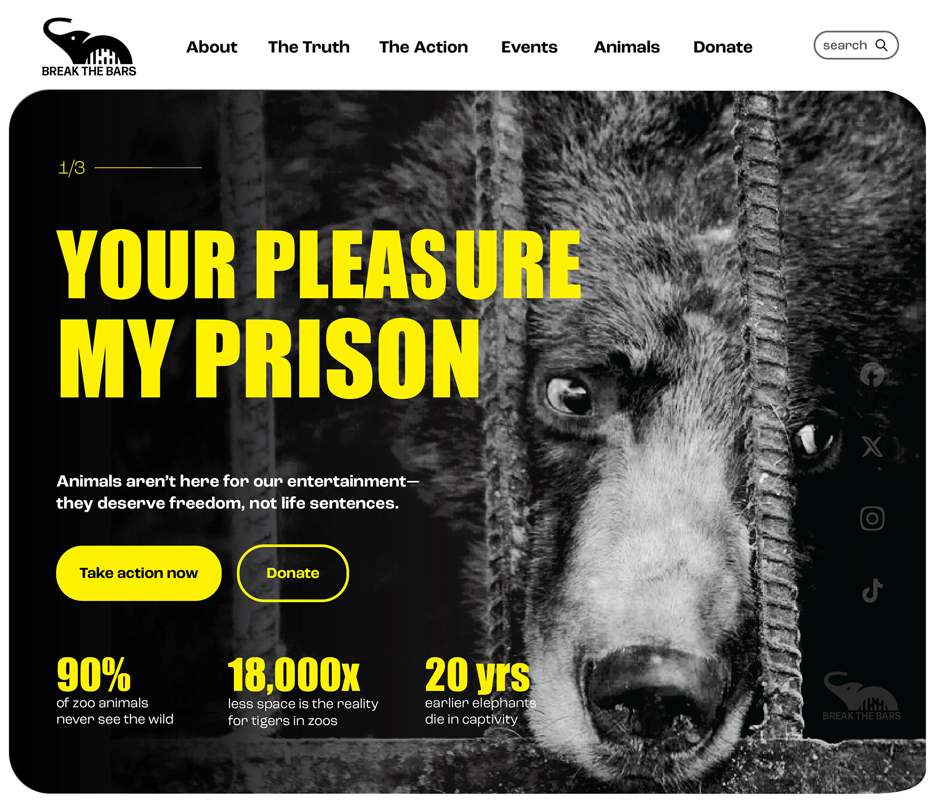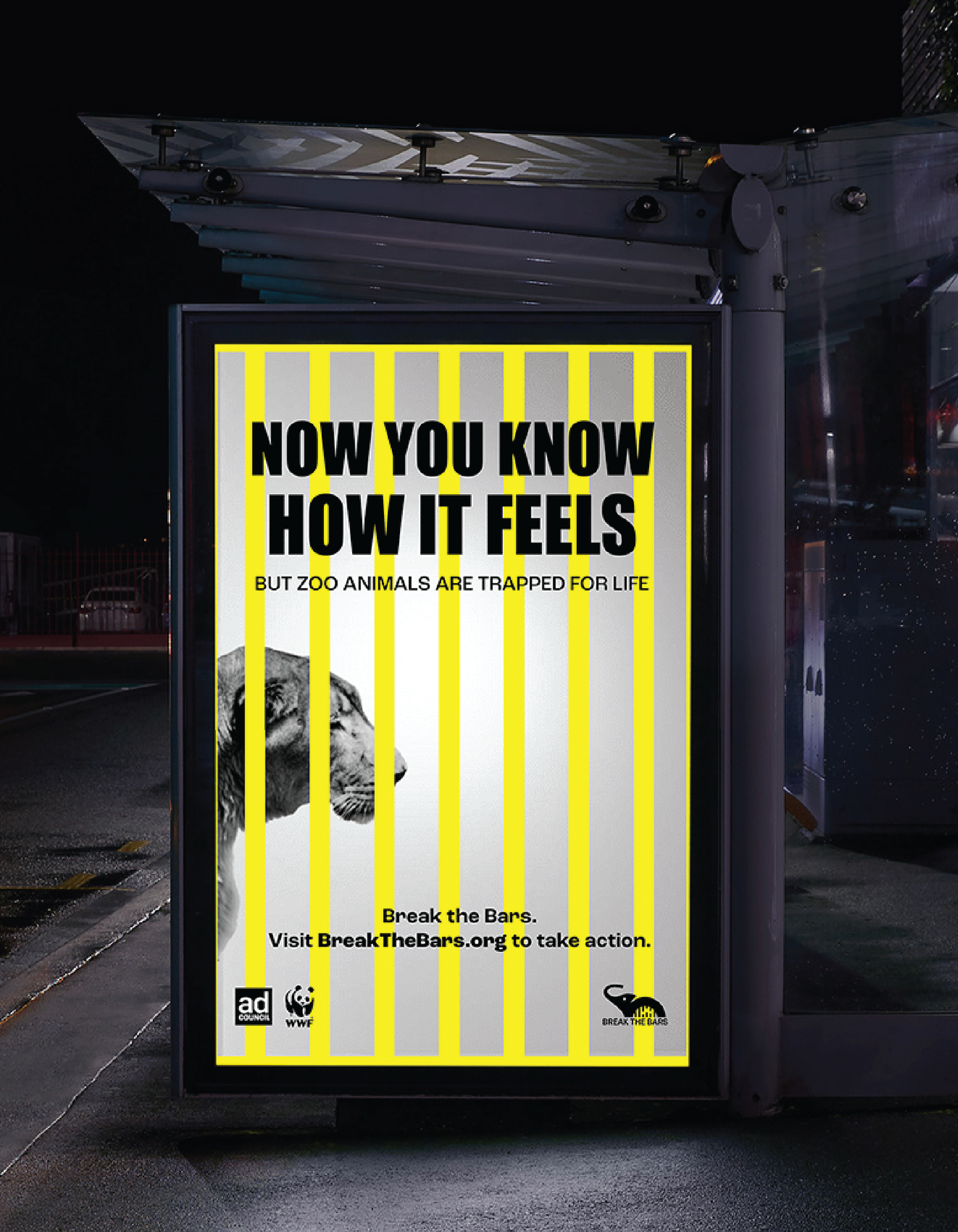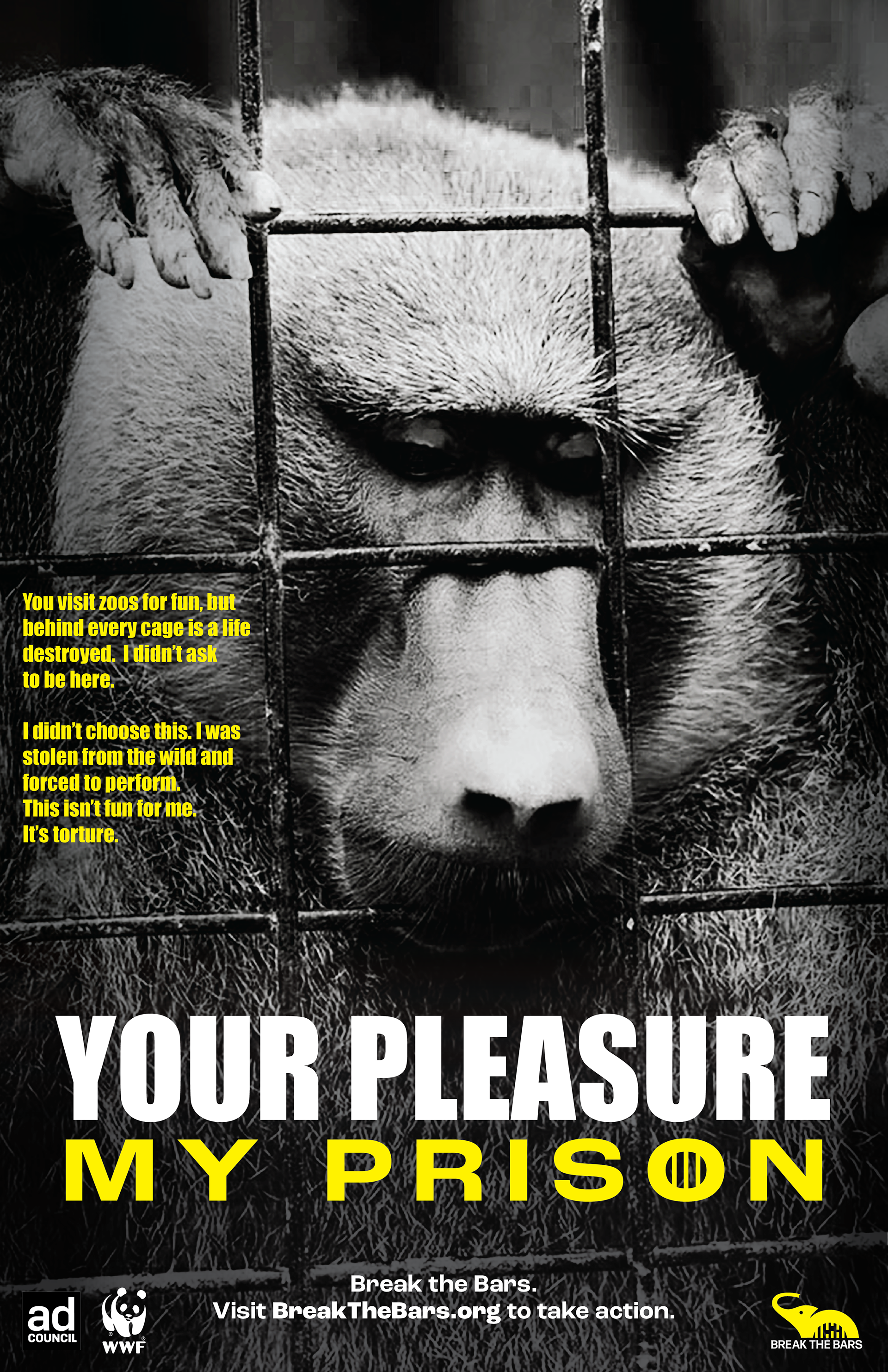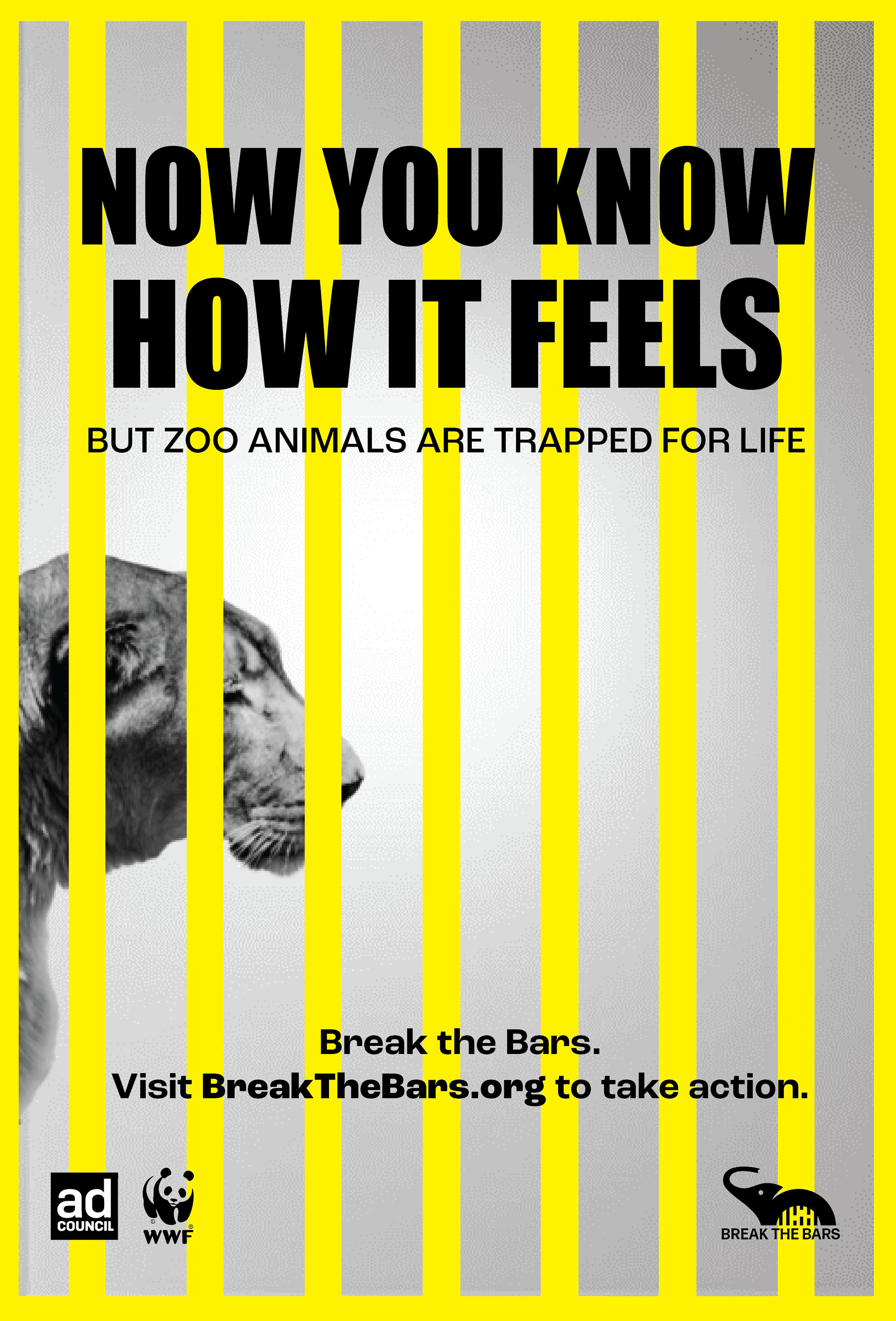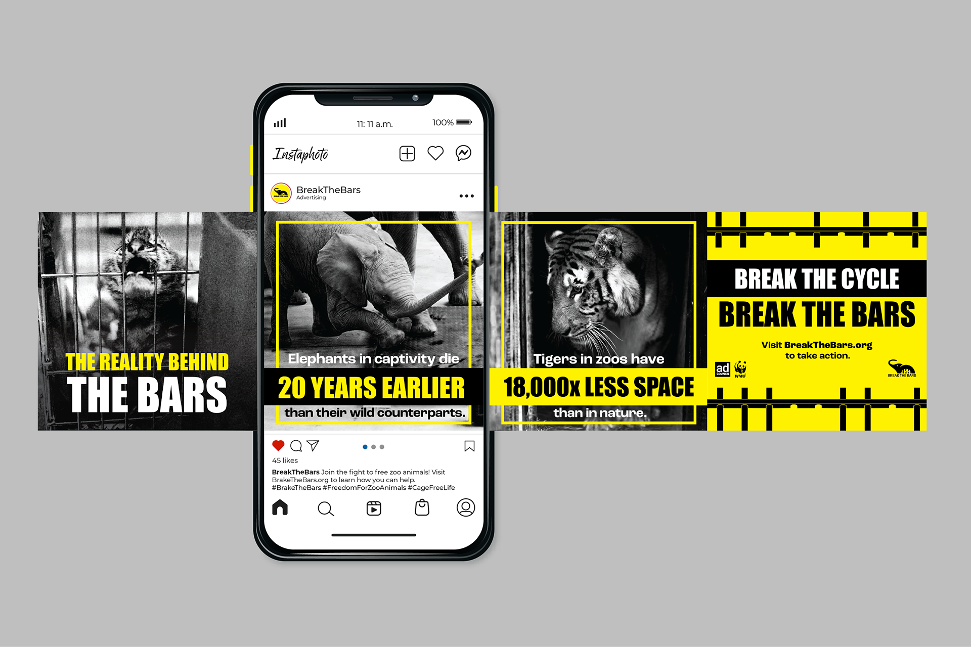 The direction centers on contrast and immediacy. Black-and-white imagery emphasizes realism and emotional weight, while a limited yellow and black palette creates urgency and high visibility across formats. The visual language draws directly from the idea of confinement—using bars, cropping, and tight framing to place the viewer in the position of the animal