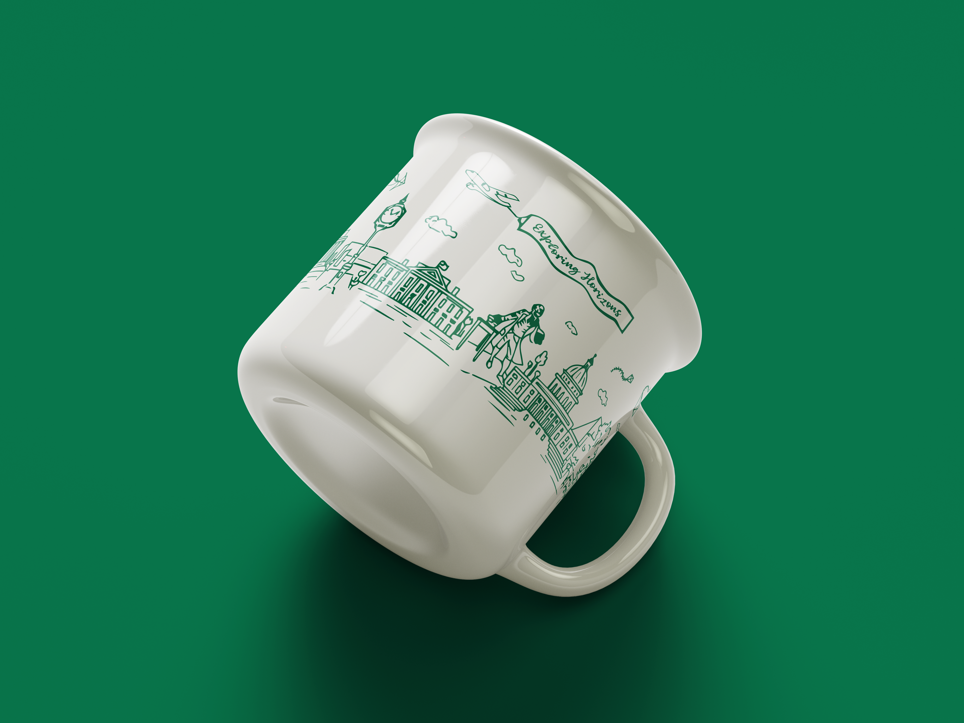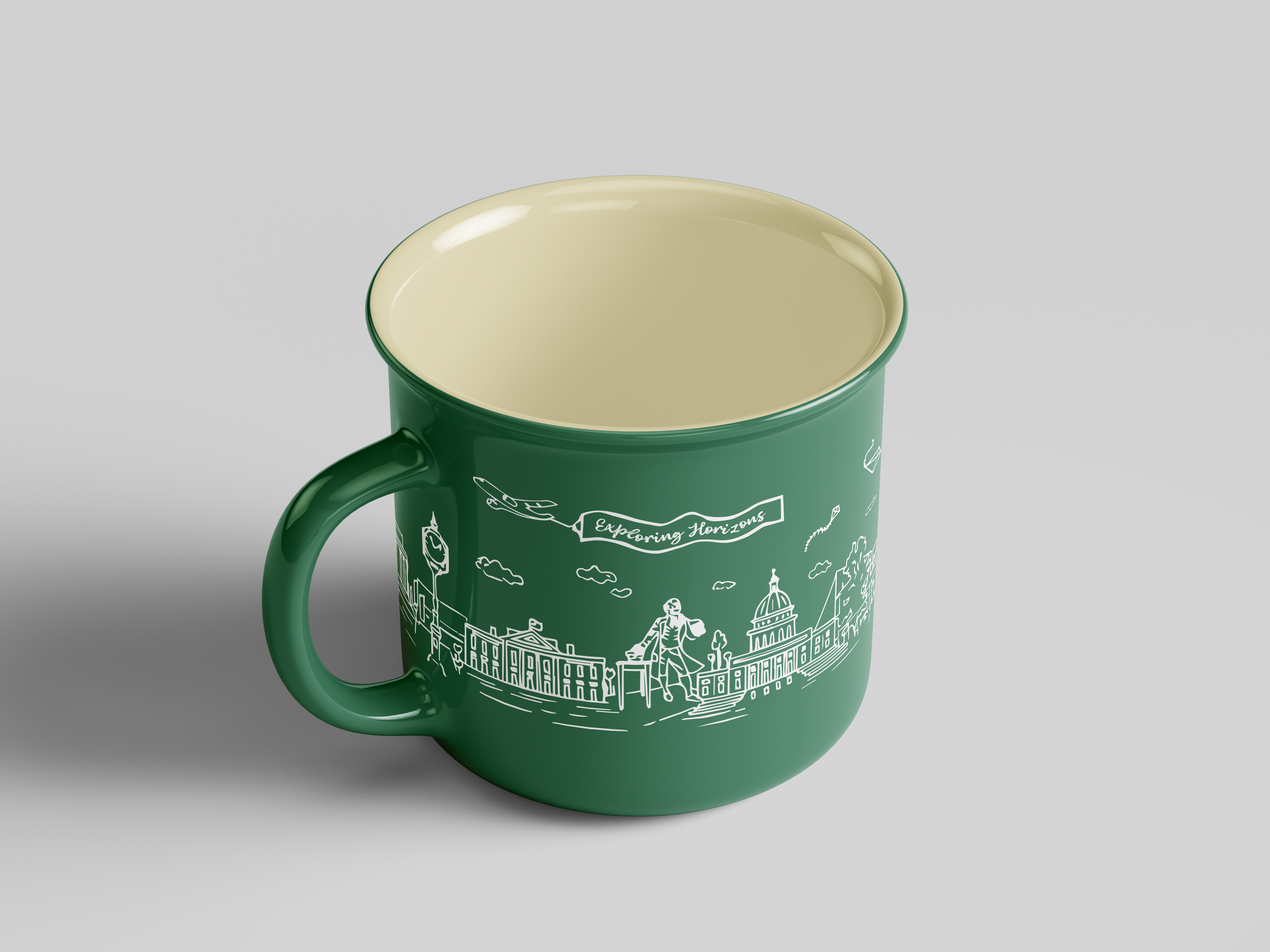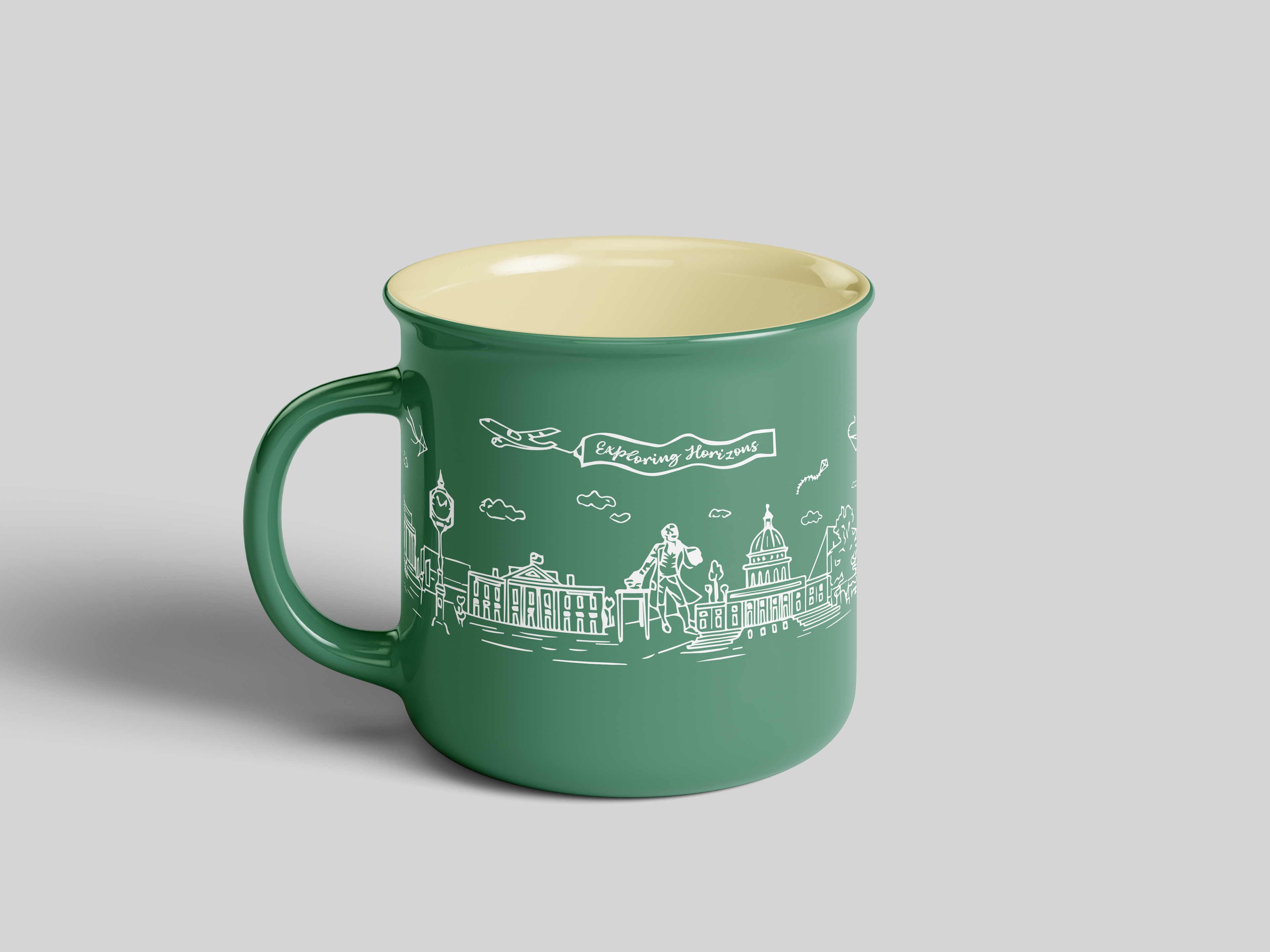 The design uses a clean, linear illustration style to maintain clarity at a small scale while allowing the mug to function as both a practical object and a storytelling surface. This approach was chosen to reinforce a sense of belonging and shared environment for students, linking campus life to the broader cultural and geographic context.