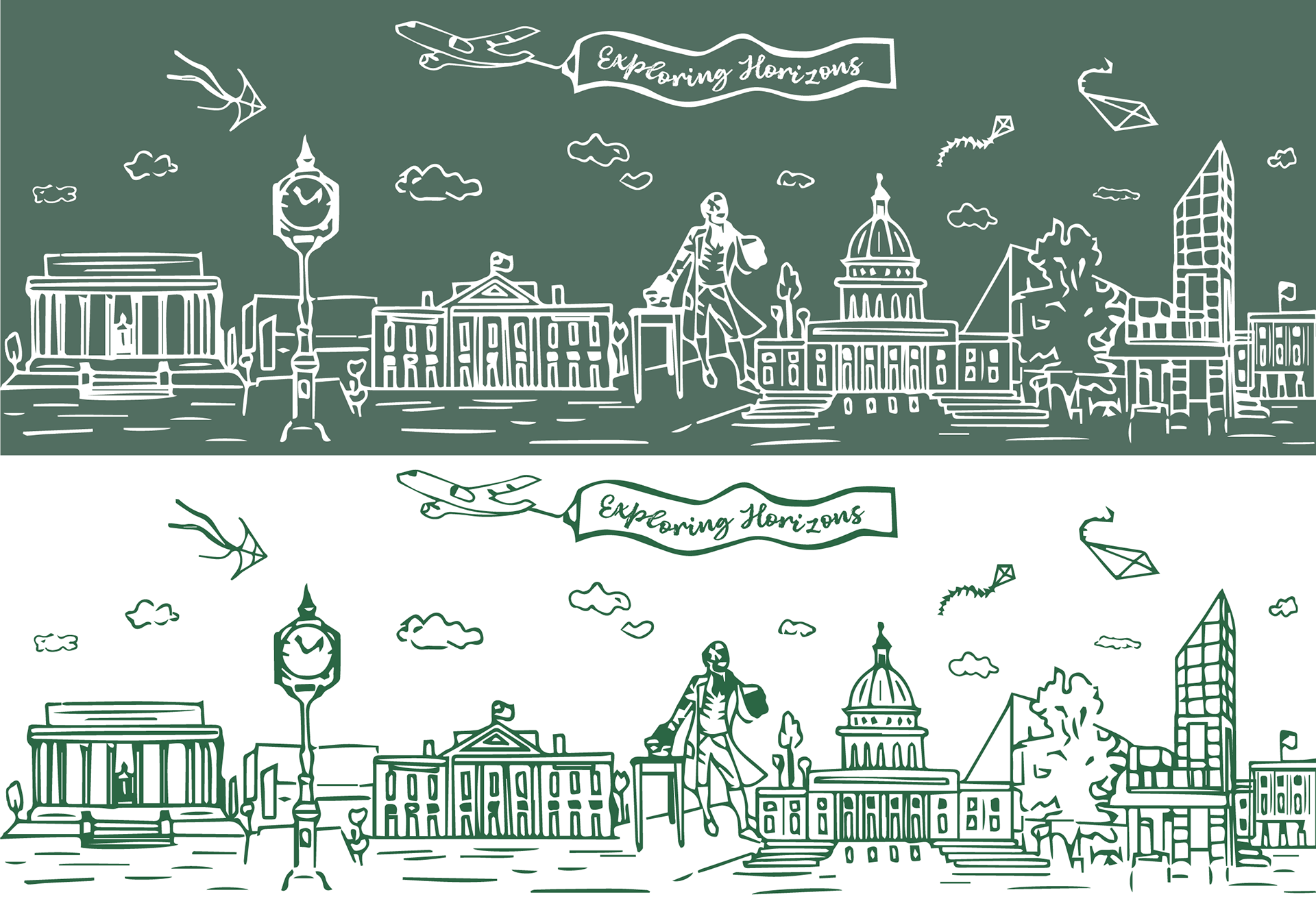 Designed for Mason Dining GMU. This project focuses on creating a strong visual connection between George Mason University and its surrounding context in Washington, D.C. The direction centers on unifying recognizable campus landmarks with iconic DC elements, forming a continuous illustrated landscape that reflects both place and identity.